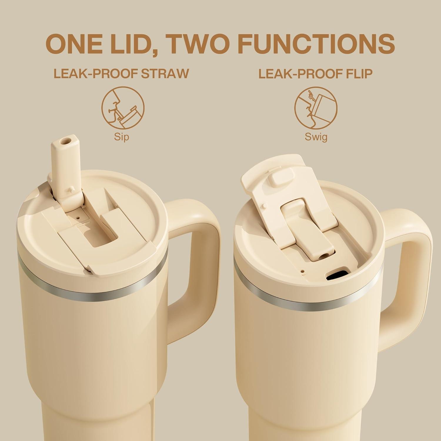 40 oz Tumbler with Handle and Straw: Stainless Steel Insulated Tumbler Keeps Cold for 24 Hours, Leakproof Travel Cup Fits in Cup Holder and BPA-Free, Avenue(Indian Khaki)