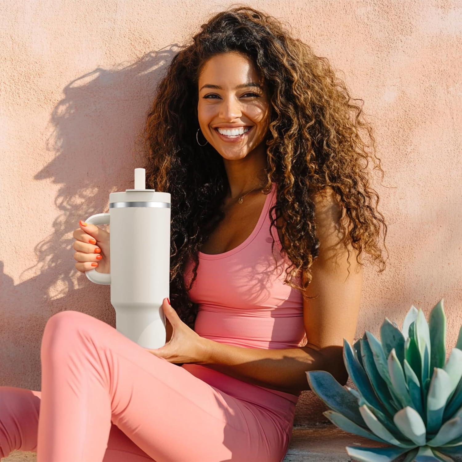 40 oz Tumbler with Handle and Straw: Stainless Steel Insulated Tumbler Keeps Cold for 24 Hours, Leakproof Travel Cup Fits in Cup Holder and BPA-Free, Evening Glow(Indian Khaki)