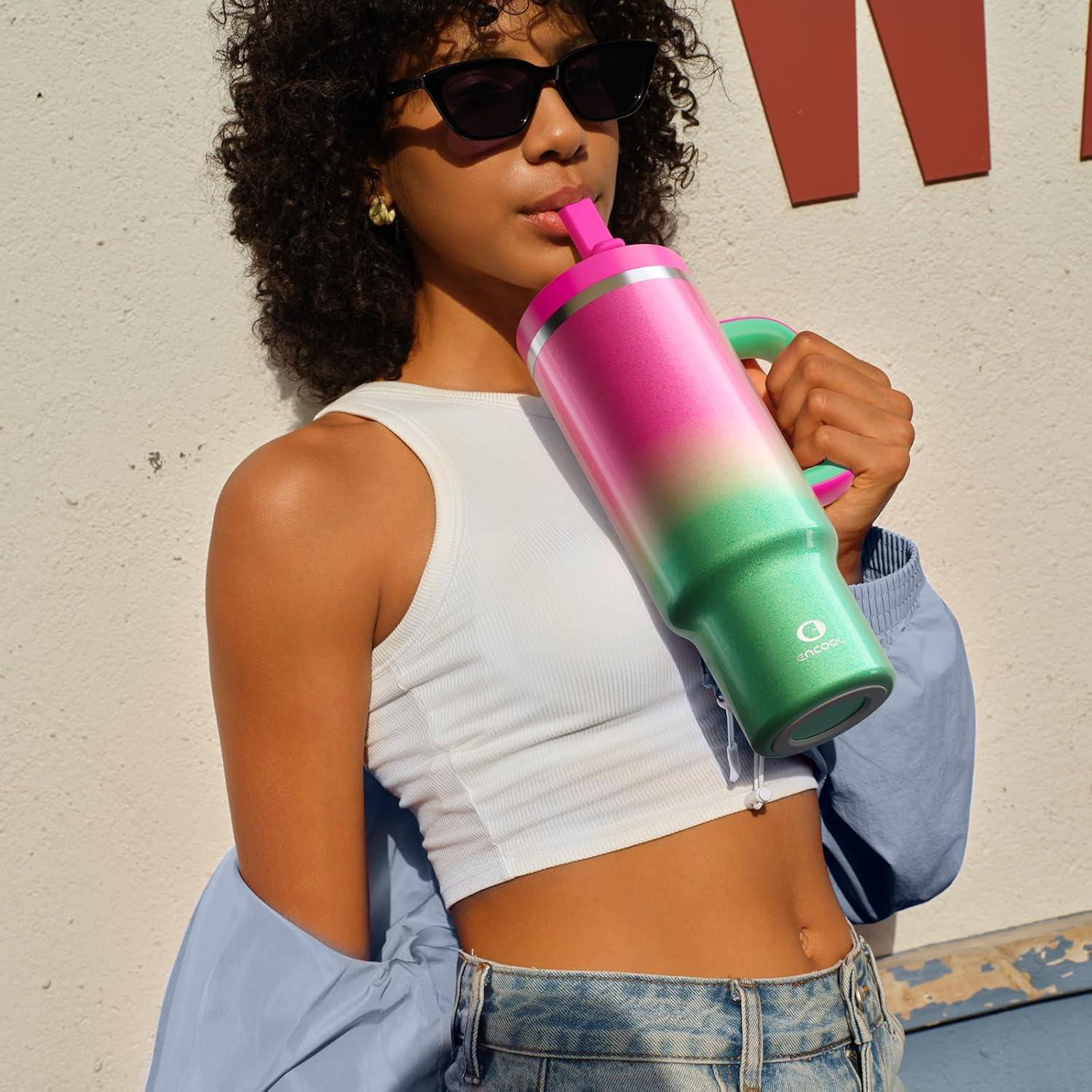 image40 oz Tumbler with Handle and Straw Stainless Steel Insulated Tumbler Keeps Cold for 24 Hours Leakproof Travel Cup Fits in Cup Holder and BPAFree Evening GlowFuchsia